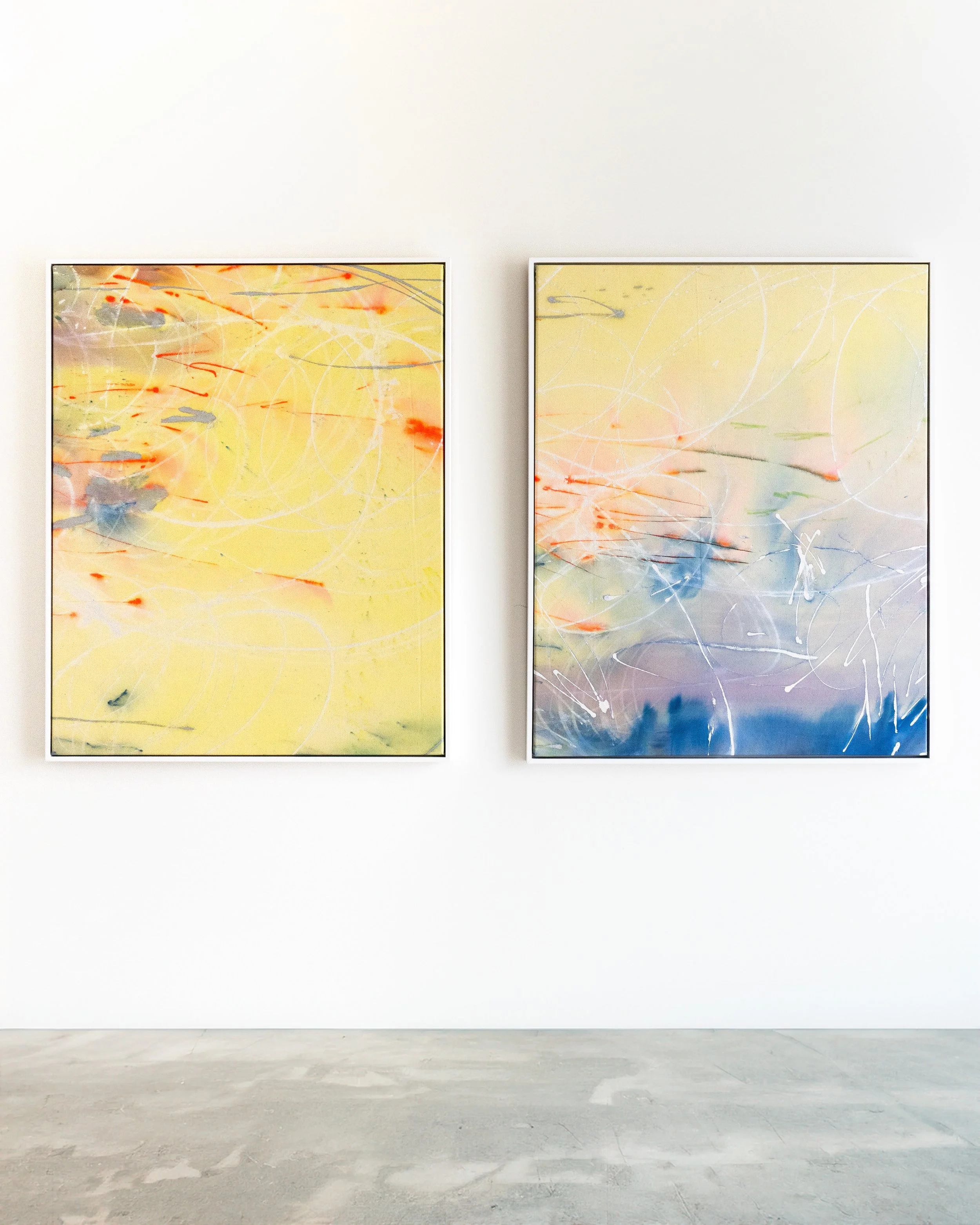 The process is physical, spontaneous, and free. Layers build and blur until emotion becomes abstraction.